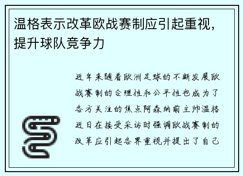 近年来,随着欧洲足球的不断发展,欧战赛制的合理性和公平性也成为了各方关注的焦点。阿森纳前主帅温格近日在接受采访时强调,欧战赛制的改革应引起各界重视,并提出了自己的见解。温格指出,当前的欧战赛制存在一些弊端,不仅影响了比赛的观赏性,也对球队的竞争力产生了负面影响。