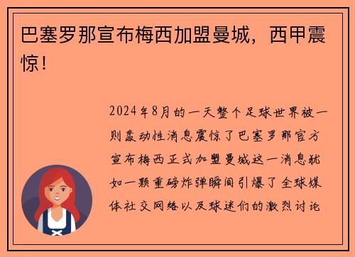 2024年8月的一天,整个足球世界被一则轰动性消息震惊了——巴塞罗那官方宣布梅西正式加盟曼城!这一消息犹如一颗重磅炸弹,瞬间引爆了全球媒体、社交网络以及球迷们的激烈讨论。作为西甲乃至全球足坛的传奇人物,梅西离开巴塞罗那、加入曼城的举动无疑让人感到不可思议。过去的十几年中,梅西几乎就是巴萨的代名词,他代表的不仅是一位足球运动员,更是一个时代的标志。如今,他的离开对西甲联赛乃至巴塞罗那俱乐部的未来都将带来深远影响。