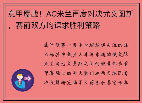 意甲联赛一直是全球球迷关注的焦点,而其中最为人津津乐道的便是AC米兰与尤文图斯之间的较量。作为意甲赛场上的两大豪门,这两支球队每次交锋都充满了火药味和悬念。而本赛季,这场巅峰对决再次来临,赛前双方均在积极谋划,力求在这场比赛中占据上风。