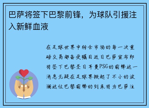 在足球世界中,转会市场的每一次重磅交易都备受瞩目。近日,巴萨宣布即将签下巴黎圣日耳曼(PSG)的前锋,这一消息无疑在足球界掀起了不小的波澜。这位巴黎前锋的到来,将为巴萨注入新鲜血液,为球队的未来发展带来新的希望与期待。
