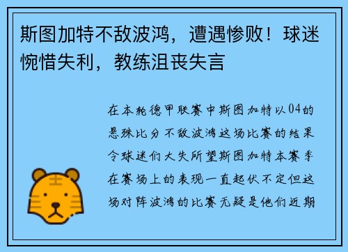 斯图加特不敌波鸿,遭遇惨败!球迷惋惜失利,教练沮丧失言